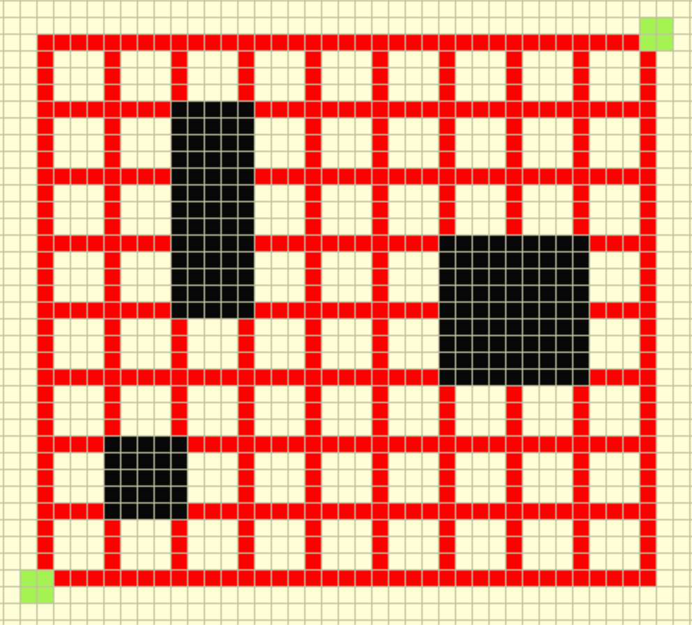 Again you need to travel from the bottom left to the top right (from green starting point to green ending point). You can only move up or to the right along the red lines. You cannot touch the black.